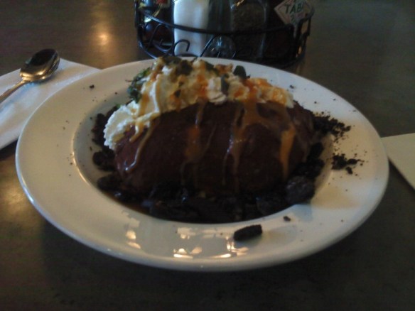 Yes, it might look like a fully-loaded baked potato… however… it is in-fact vanilla bean ice cream rolled in cocoa powder and topped with whip cream, caramel sauce, and mint leaves… the “dirt” around the bottom is crushed oreo cookies and chocolate fudge. It’s called the “Irish Potato Sundae” and it’s the dessert the Stone of Accord is known for.