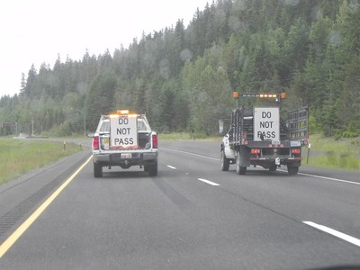 About 60 miles outside Seattle, I started seeing signs that trucks would be entering the highway to slow traffic, so the heavy machinery/LARGE trucks could get in place for some rock blasting/construction. I’ve been behind something like this before… it is painful… so when I saw the flashing lights enter the highway… in FRONT of me… I did what anyone WOULD do in that situation…. get behind the guy, so as soon as he moves I can GO!