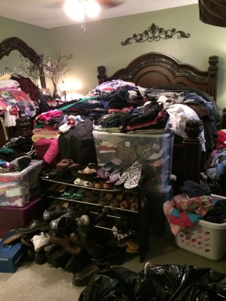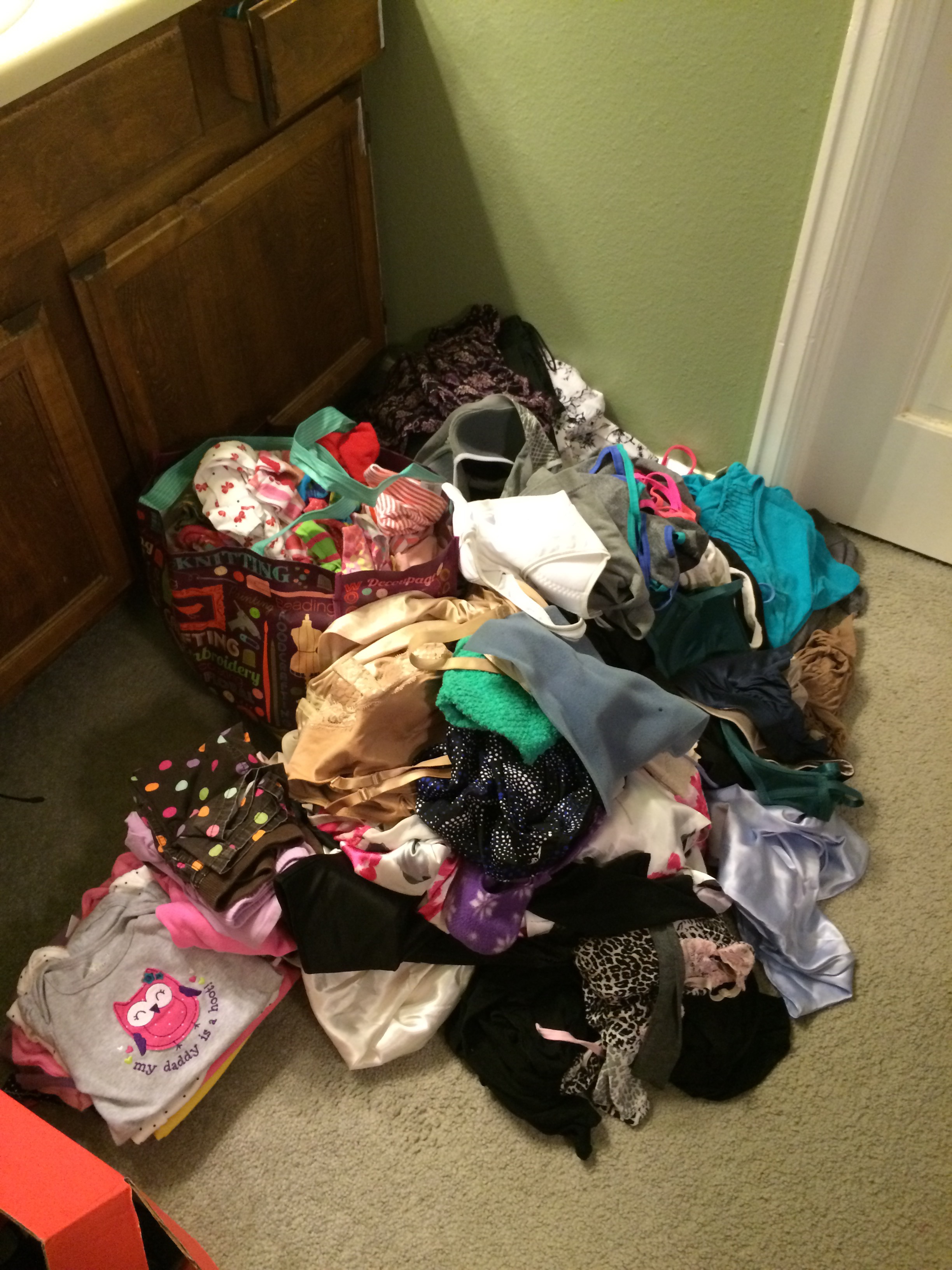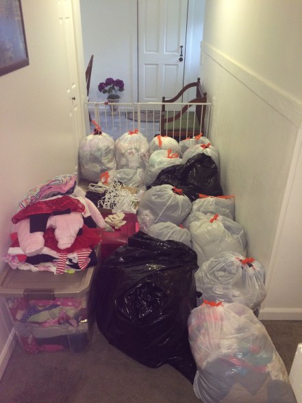 This is: one bag of shoes, one bag of legit TRASH clothes, one bag of my husband’s stuff, and the rest were mine and the girls’. This photo is missing the large box of maternity stuff we were able to send to a loving home…