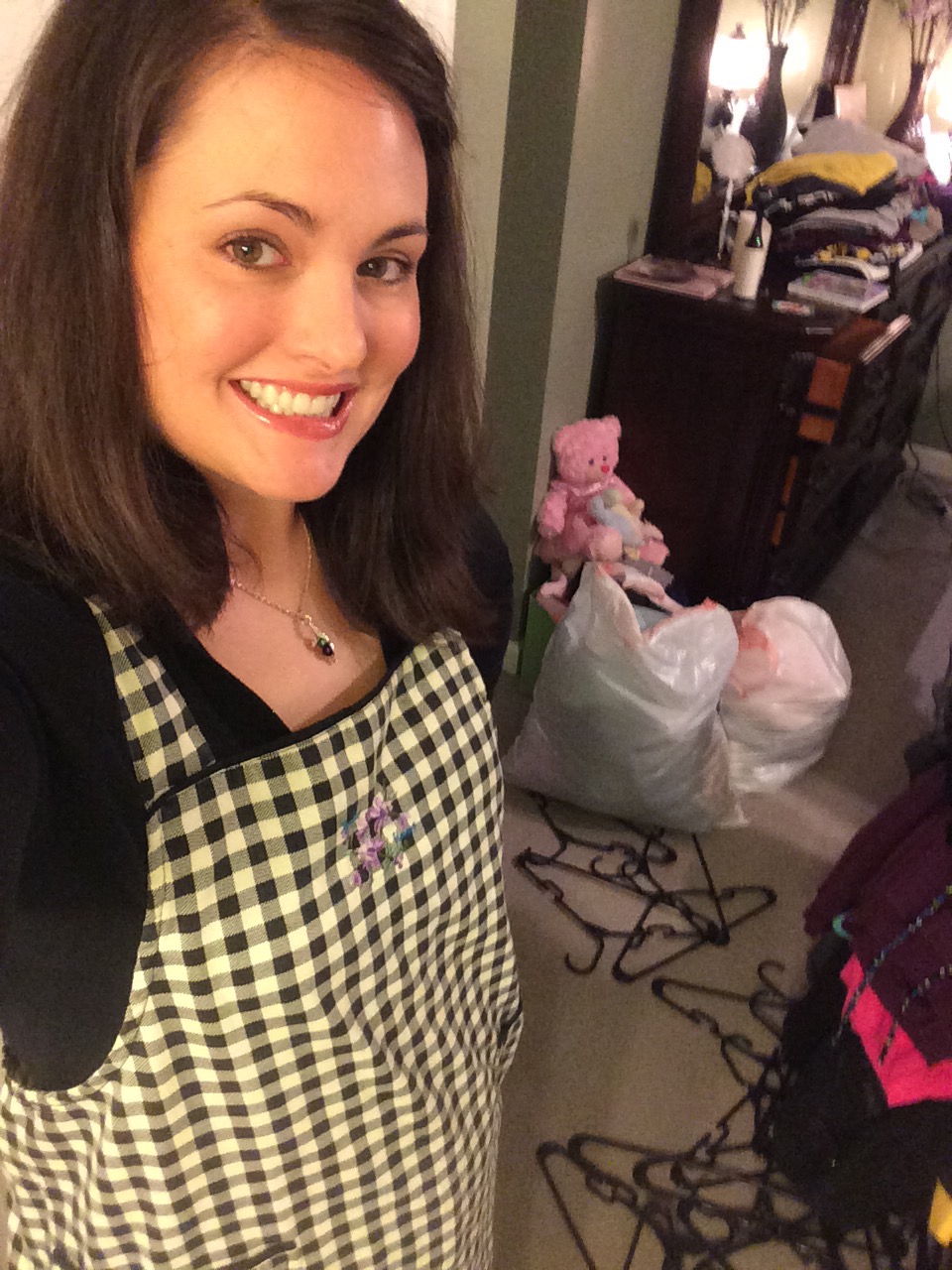 She also recommends you dress up for the event! Nicer clothing than you’d normally wear to purge. (ahem– yoga pants and a t-shirt) The next picture is after a full day of wearing my dress, hair done, and make-up done… but I also added my Japanese apron (most of the homemakers in Japan wear these when they go to grocery stores or other household related errands). I do have to say, it definitely improved my mood!!