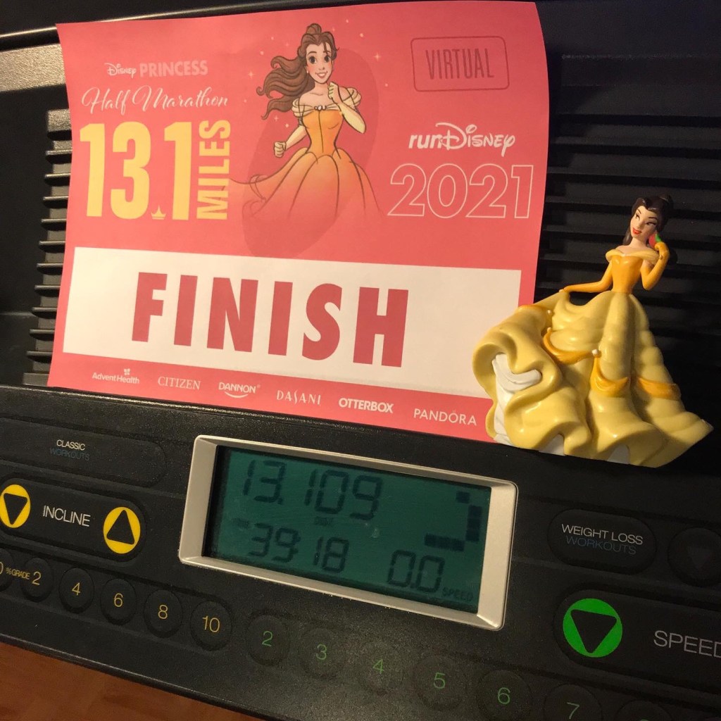 I’d never done a half before. And knowing how slow my mile is right now… the thought of being on my treadmill for more than 4 hours straight was daunting. Thankfully, I’ve done the Hot Chocolate 15k (in-person) and so I knew I could do 9.321 miles… a half is only 4 more miles than that. It would be a challenge… but I was optimistic about finishing!